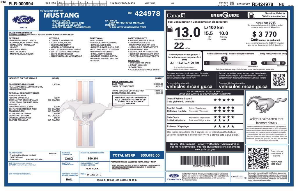 2024 Ford Mustang GT RWD Dark Matter Gre 5.0L V8 Ti-VCT