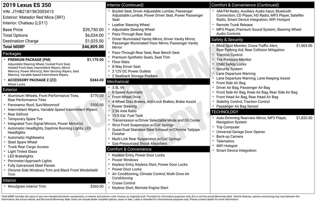 2019 Lexus ES 350 FWD Matador Red 8-Speed Automatic 3.5L V6 DOHC Dual VVT-i 24V Awards: