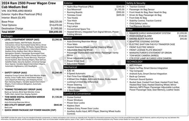 Recent Arrival! ***** Clean CARFAX *****2024 RAM 2500 POWER WAGON 4WD*****4X46.4' Bed LengthAccident Avoidance SystemsActive Noise CancellationActive Parking SystemAdjustable Lumbar SupportAdjustable PedalsAndroid AutoAnti-Theft SystemApple CarplayApproach LightsAudio Voice RecognitionAuto-dimming Rearview MirrorBlind Spot WarningBluetoothBraking AssistBucket SeatsCamera SystemCamera-based Rearview MirrorCheck Rear Seat ReminderChrome Shift KnobConnected CarConnected Car Integrated AppsCooled SeatsCrash SensorsCruise ControlCurtain AirbagsCustomizable Instrument DisplayDriver Assistance PackageElectronic 4WD SelectorElectronic Braking SystemElectronic Messaging AssistanceElectronic Traction ControlEmergency Braking PreparationEngine Block HeaterFog LightsFront Bucket SeatsFull Size Spare TireHeated SeatsHeated Side MirrorsHeated Steering WheelHood ScoopLeather Steering WheelLeather Trimmed SeatsLift Assist TailgateLocking DifferentialMemorized Seat SettingsMulti-Function DisplayNavigation SystemOff-Road SuspensionOn Demand 4WDParking SensorsPickup Bed LinerPower Adjustable PedalsPower Locking TailgatePower SeatsPower Sliding Rear WindowPreferred Equipment GroupPremium Sound SystemPush-Button StartRadio Data SystemReal Time TrafficRear Cross Traffic AlertRear HeadrestsRear Privacy GlassRearview CameraRemote Engine StartRemovable TailgateRunning BoardsSatellite RadioSide AirbagsStability ControlSteering Wheel Mounted ControlsSurround View CameraTailgate Illumination Pickup Bed LightTire Pressure Monitoring SystemTow HooksTow/Haul ModeTowing MirrorsTrailer Brake ControllerTrailer HitchTrailer WiringTurn Signal MirrorsUSB Audio InputVoice Activated CommandsWi-Fi CompatibleWinch*****All vehicles are one of each. All Pre-Owned or Certified vehicles are Used. The offering price of this vehicle is conditioned on a negotiated waiver of implied warranties if the Buyers Guide on the vehicle is AS IS-NO DEALER WARRANTY. If the Buyers Guide on the vehicle is IMPLIED WARRANTIES ONLY, the offering price includes implied warranties. A dealer documentary service fee of up to $200 may be added to the sale price or capitalized cost. All financing is subject to credit approval. Prices exclude tax, title, and license and are valid for Washington residents only. All transactions are negotiable including price, trade allowance, interest rate (of which the dealer may retain a portion), term, and documentary service fee. Any agreement is subject to execution of contract documents. Every reasonable effort is made to ensure the accuracy of this data. Please verify any information in question with a dealership sales representative.