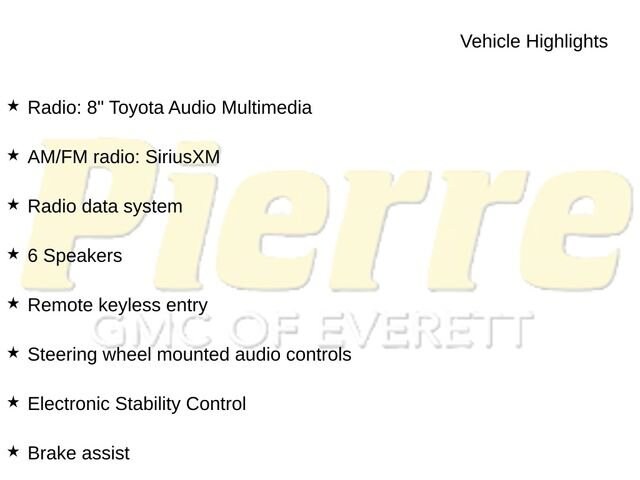 - CADS Features: 6 Speakers, AM/FM radio: SiriusXM, Radio data system, Radio: 8 Toyota Audio Multimedia, Air Conditioning, Automatic temperature control, Rear window defroster, Power steering, Power windows, Remote keyless entry, Steering wheel mounted audio controls, Speed control, Brake assist, Electronic Stability Control, Four wheel independent suspension, Traction control, Auto High-beam Headlights, Delay-off headlights, Fully automatic headlights